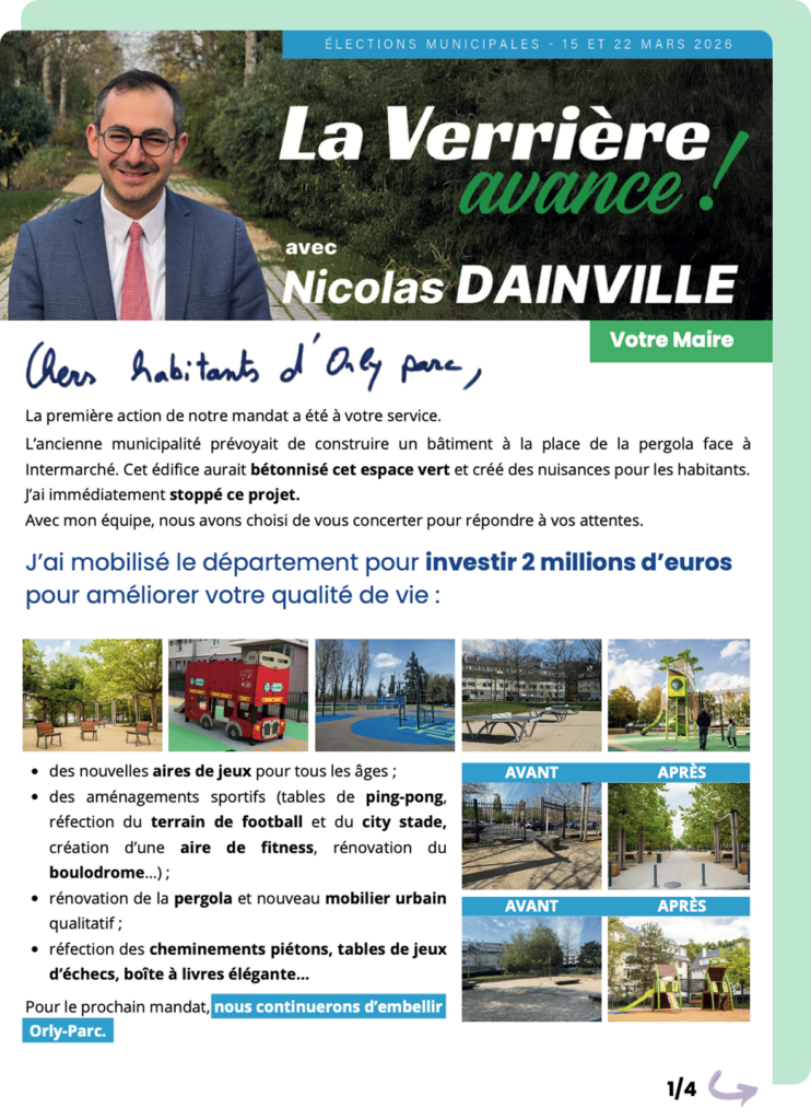 Vous appréciez la nouvelle crèche, les outils pédagogiques innovants, le nouveau Club Ados, les aménagements des espaces publics d’Orly parc, la rénovation de la gare, les jumelages avec le Centre de musique baroque ou avec la Gendarmerie nationale, la brigade canine et l’équipe de médiation, ou encore nos beaux événements (Paris-Nice, Passionnément mustang, chasse aux œufs, marché de Noël…).